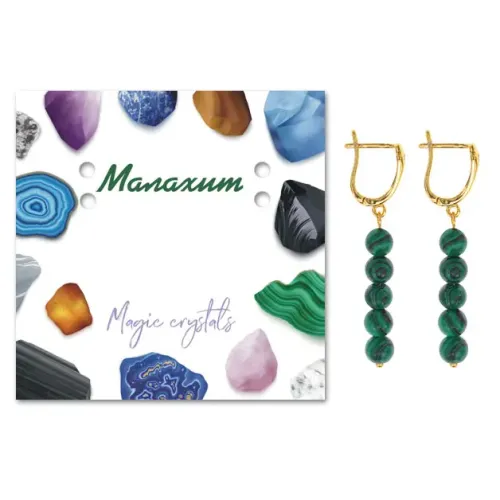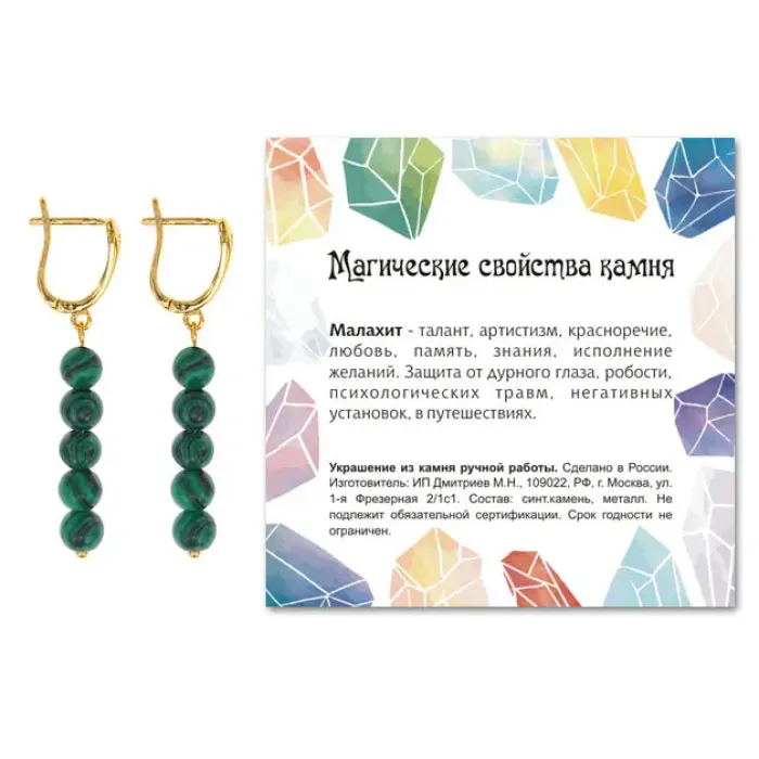 Серьги ручной работы, выполненные с использованием качественной корейской фурнитуры и синтетического камня Малахит, символизирующего гармонию и защиту. Эти изысканные серьги длиной 50 мм (включая швензу) и диаметром бусин 6 мм добавят яркий акцент в любой образ. Фурнитура изготовлена из бижутерного сплава с прочным покрытием под золото, что обеспечивает долговечность изделия. Упаковка включает прозрачный пакет с подвесом и вкладыш с описанием значения камня, что делает их отличным подарком для близких.
