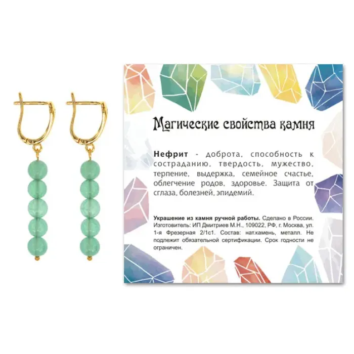 4. Упаковка включает прозрачный пакет с подвесом и вкладыш с описанием значения нефрита, что делает серьги отличным подарком.
