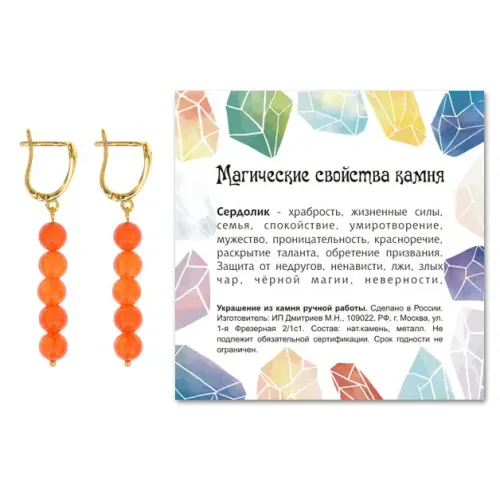 Материал и изготовление: Натуральный камень сердолик, бижутерный сплав с покрытием под золото. Изготовлены вручную.