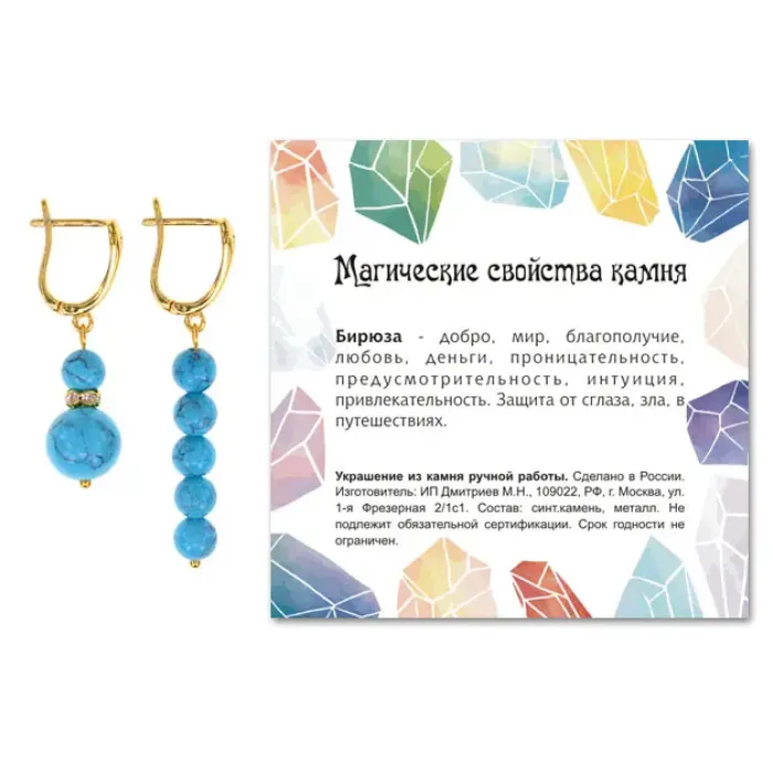 3. Каждая пара упакована в прозрачный пакет с подвесом и включает вкладыш с описанием значения камня бирюзы, что добавляет ценности изделию.