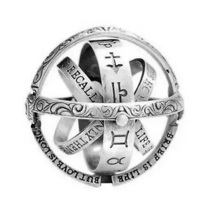 Астрономическое кольцо - кулон — это уникальное украшение, которое сочетает в себе элегантность и функциональность. Оно может использоваться как кольцо на пальце или как стильный кулон на шее. Оригинальный механизм позволяет складывать его в компактное кольцо и раскладывать в сферу, что делает аксессуар особенно привлекательным для любителей необычных форм. Все внутренние кольца вращаются, добавляя элемент динамики и интерактивности в дизайн.