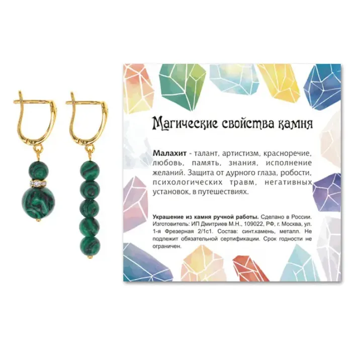 - Упаковка включает прозрачный пакет с подвесом и вкладыш с описанием значения камня, что делает серьги идеальным подарком для близких.