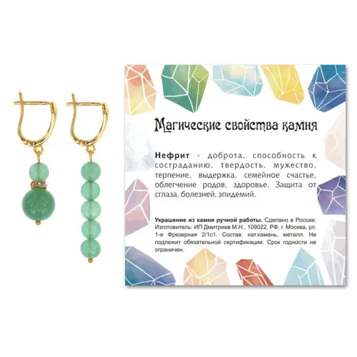 Серьги упакованы в прозрачный пакет с подвесом, а также укомплектованы вкладышем с описанием значения нефрита, который традиционно ценится за свою гармонизирующую энергию. Это идеальный аксессуар для тех, кто ищет стильное дополнение к своему образу или оригинальный подарок для близких.