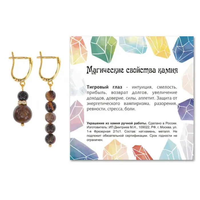 Асимметричные серьги, выполненные вручную, с использованием качественной корейской фурнитуры и натурального камня Тигровый глаз. Эти уникальные украшения не только привлекают внимание своим оригинальным дизайном, но и символизируют силу и защиту. Длина серег (включая швензы) составляет 40 мм и 50 мм, а диаметр бусин – 6 мм и 10 мм. Фурнитура из бижутерного сплава имеет прочное покрытие под золото, что обеспечивает долговечность изделия. Каждая пара упакована в прозрачный пакет с подвесом и укомплектована вкладышем с описанием значения камня, что делает их отличным подарком или дополнением к личной коллекции.