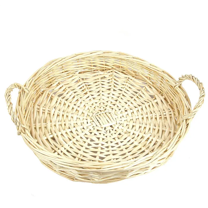 Поднос изготовлен из обработанной и окрашенной ивы, что обеспечивает прочность конструкции. Наличие двух ручек облегчает перенос. Круглая форма диаметром 35 см делает поднос универсальным для сервировки.