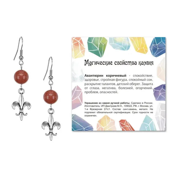 Серьги-амулеты коллекции MAGIC CRISTALS 2 с синтетическим камнем Коричневый авантюрин символизируют достоинство, власть и успех. Эти изысканные украшения не только дополнят любой образ, но и станут прекрасным талисманом. Основные характеристики: диаметр бусин составляет 10 мм, а материал фурнитуры — бижутерный сплав с покрытием под серебро. Швенза выполнена в виде крючка для удобства ношения. Каждая пара упакована в прозрачный пакет с подвесом и укомплектована вкладышем с описанием значения камня, что делает эти серьги отличным подарком или сувениром. В культуре многие ценят коричневый авантюрин за его способность приносить удачу и уверенность.