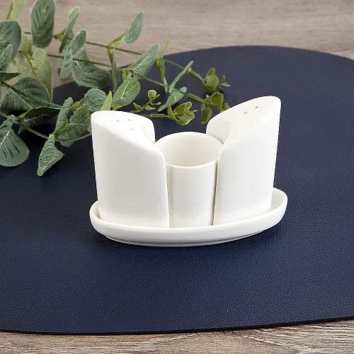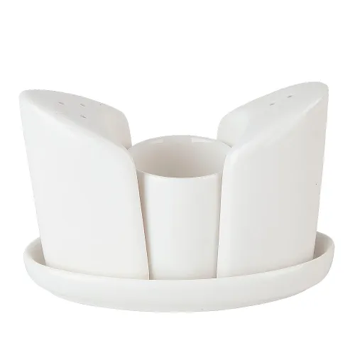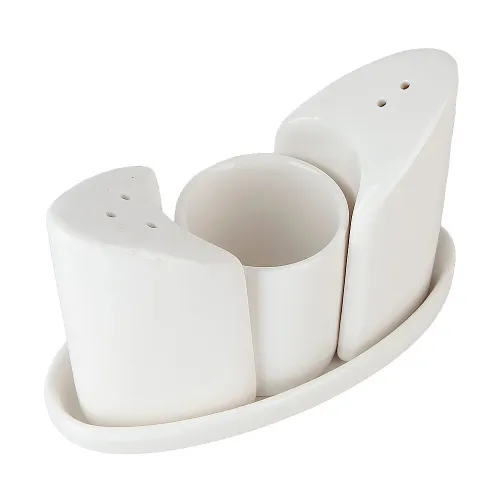 Изделия изготовлены из фарфора, который характеризуется прочностью и устойчивостью к высоким температурам. Белое глазурованное покрытие обеспечивает стойкий блеск и устойчивость к потускнению. Конструкция набора включает отдельные предметы для соли, перца и зубочисток, а также общую подставку для их компактного размещения.