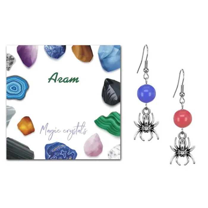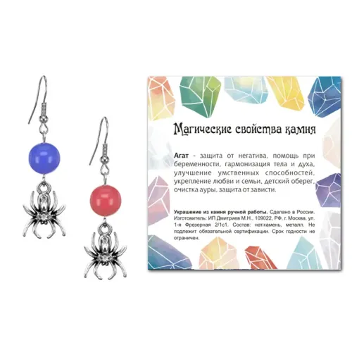 Серьги Паук (защита, трудолюбие, достаток), Цветной агат SEB07-03-14