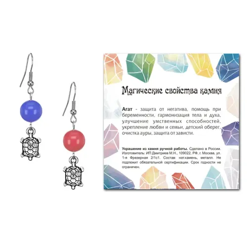 Серьги Черепаха (здоровье и долголетие), Цветной агат SEB07-03-16