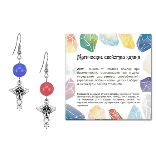 Серьги Кадуцей (здоровье, бизнес, гармония), Цветной агат SEB07-03-33