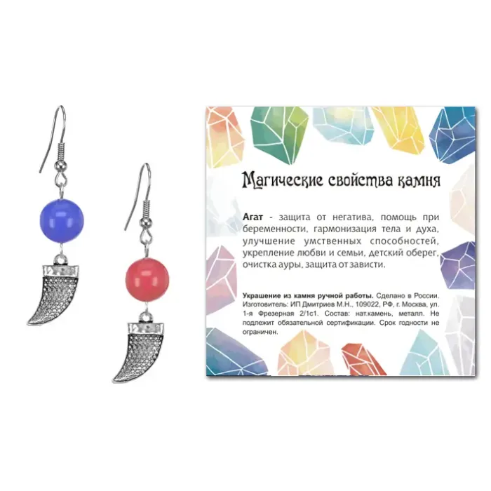 Серьги-амулеты коллекции MAGIC CRISTALS 2 с натуральным камнем Цветной агат. Эти уникальные серьги символизируют силу, мужество и энергию, что делает их идеальным аксессуаром для тех, кто стремится к внутренней гармонии. Каждая бусина диаметром 10 мм выполнена в разнообразных цветах, что придаёт изделию индивидуальность и неповторимость. Фурнитура из бижутерного сплава с покрытием под серебро обеспечивает долговечность и стильный внешний вид. Серьги имеют тип швензы - крючок для удобства ношения. Упаковка включает прозрачный пакет с подвесом и вкладыш с описанием значения камня, что добавляет дополнительную ценность к этому подарку.