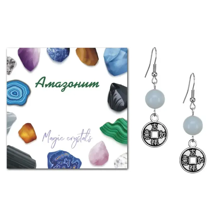 Серьги-амулеты из коллекции MAGIC CRISTALS 2, выполненные с использованием натурального камня Амазонит, символизируют богатство и гармонию. Эти стильные серьги имеют диаметр бусин 10 мм и изготовлены из бижутерного сплава с покрытием под серебро, что придаёт им элегантный вид. Тип швензы — крючок, обеспечивающий удобство носки. Каждая пара упакована в прозрачный пакет с подвесом и дополнена вкладышем, рассказывающим о значении камня. Серьги традиционно используются как оберег для привлечения удачи и благополучия.