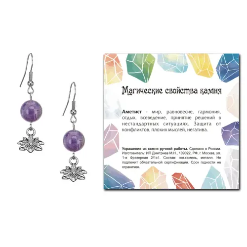 Серьги-амулеты коллекции MAGIC CRISTALS 2 с натуральным камнем Аметист символизируют гармонию и развитие, привнося в жизнь позитивную энергию. Эти изысканные серьги имеют диаметр бусин 10 мм и выполнены из бижутерного сплава с покрытием под серебро, что придаёт им элегантный вид. Тип швензы — крючок, обеспечивающий удобство ношения. Каждая пара упакована в прозрачный пакет с подвесом и комплектуется вкладышем с описанием значения камня, что делает их отличным подарком или личным амулетом. Аметист традиционно ценится за свои успокаивающие свойства и считается защитником от негативной энергии.