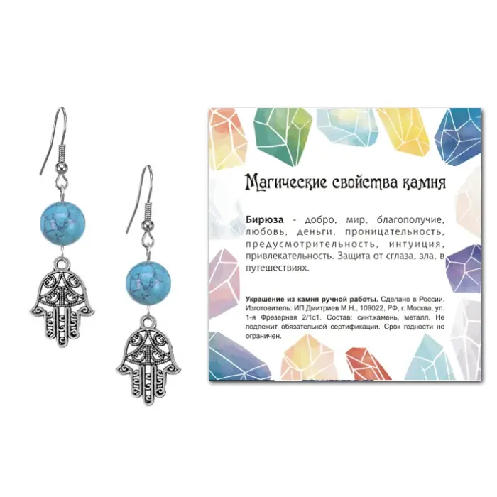 - Упаковка в прозрачный пакет с подвесом делает эти серьги отличным вариантом для подарка или личного использования. В комплекте также идет вкладыш с описанием значения камня бирюзы.