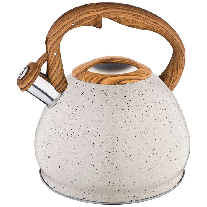 Корпус чайника выполнен из нержавеющей стали. Термоаккумулирующее дно имеет алюминиевую прослойку для равномерного распределения тепла. Ручка оснащена клапаном для безопасного наполнения и не нагревается во время использования. Встроенный свисток сигнализирует о закипании воды.