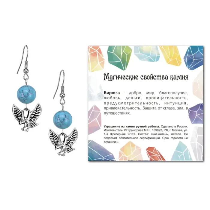 Серьги-амулеты коллекции MAGIC CRISTALS 2 с символикой силы и победы. Изготовлены из бижутерного сплава с покрытием под серебро и украшены синтетическим камнем бирюза диаметром 10 мм. Тип швензы — крючок, что обеспечивает комфортную носку. Каждая пара упакована в прозрачный пакет с подвесом и дополнена вкладышем, рассказывающим о значении камня. Эти серьги не только стильный аксессуар, но и талисман для тех, кто ценит защиту и силу в своей жизни.