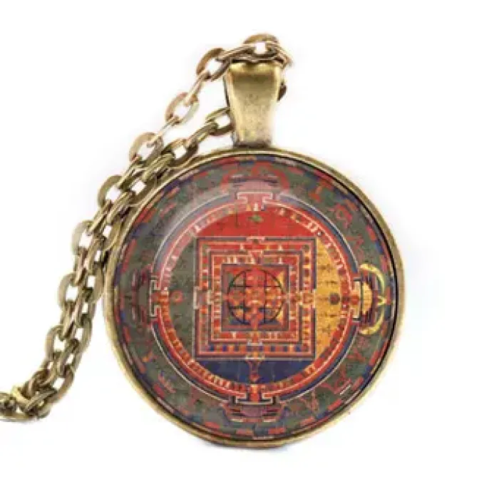 Кулон с цепочкой Манджушри мандала — это уникальное украшение, которое сочетает в себе красоту и символику буддизма. Изготовленный из бижутерного сплава с покрытием под бронзу, он привлекает внимание своей выпуклой стеклянной линзой.