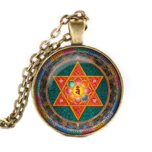Кулон с цепочкой Ваджрайогини мандала — это уникальное украшение, которое сочетает в себе элементы буддийской культуры и современный стиль. Изготовленный из бижутерного сплава с покрытием под бронзу, кулон привлекает внимание своей выпуклой стеклянной линзой, которая придаёт ему особую выразительность.