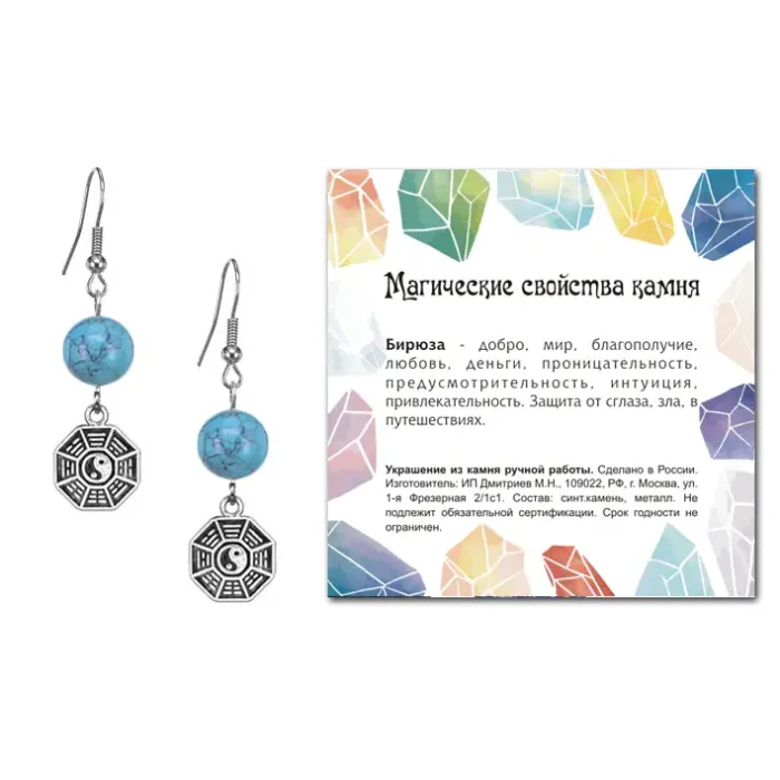 Серьги Багуа — это стильные серьги-амулеты из коллекции MAGIC CRISTALS 2, которые не только дополняют образ, но и служат защитой от негативной энергии. Синтетический камень бирюзы, символизирующий гармонию и спокойствие, придаёт изделию особую ценность.