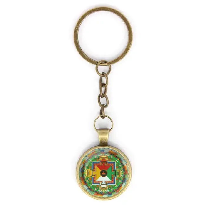 Брелок Ямантака мандала — это уникальный аксессуар с глубоким символическим значением, олицетворяющий силу и защиту. Изготовленный из бижутерного сплава с покрытием под бронзу, он привлекает внимание своим элегантным дизайном и выпуклой стеклянной линзой.