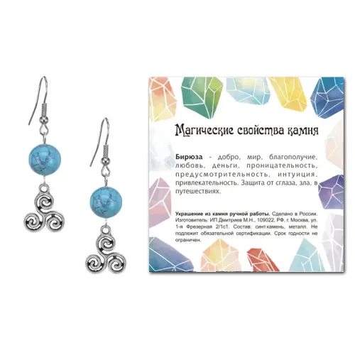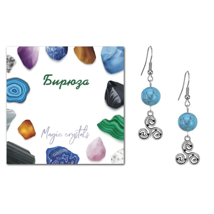 4. Каждая пара упакована в прозрачный пакет с подвесом и включает вкладыш с описанием значения камня бирюзы.