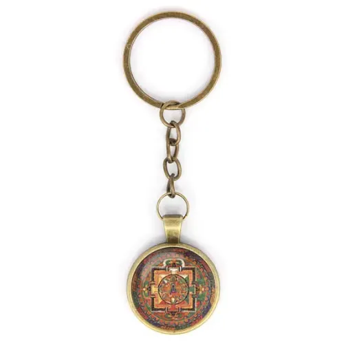 Брелок Акшобхья мандала — это стильный аксессуар, который сочетает в себе эстетическую красоту и символику. Изготовленный из бижутерного сплава с покрытием под бронзу, он привлекает внимание своим уникальным дизайном и выпуклой стеклянной линзой.