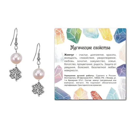 Серьги-амулеты из коллекции MAGIC CRISTALS 2 символизируют удачу и везение. Изготовленные с использованием натурального речного жемчуга, они привносят в образ нотки элегантности и гармонии. Диаметр бусин составляет 10 мм, что делает их заметными, но не слишком громоздкими. Фурнитура выполнена из бижутерного сплава с покрытием под серебро, обеспечивая долговечность и стильный внешний вид. Швензы типа крючок гарантируют надежную фиксацию на ушах. Упаковка включает прозрачный пакет с подвесом и вкладыш с описанием значения камня, что делает серьги отличным подарком для близких.