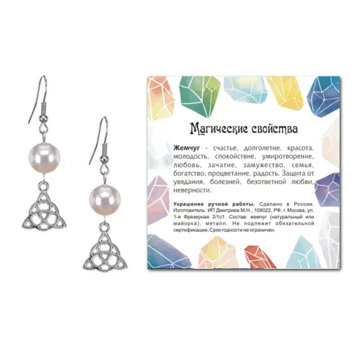 Серьги Трикветр — это изысканные серьги-амулеты из коллекции MAGIC CRISTALS 2, символизирующие защиту и гармонию. Эти украшения выполнены с использованием высококачественного синтетического жемчуга Майорка, диаметр бусин составляет 10 мм. Фурнитура изготовлена из бижутерного сплава с покрытием под серебро, что придаёт изделию элегантный вид. Тип швензы — крючок, обеспечивающий комфортное ношение. Каждая пара упакована в прозрачный пакет с подвесом и комплектуется вкладышем с описанием значения камня, что делает их идеальным подарком для ценителей красоты и символики.
