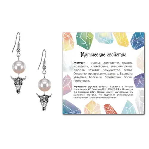 Серьги Череп быка из коллекции MAGIC CRISTALS 2 — это не просто украшение, а мощный амулет, символизирующий силу и защиту. Изготовленные с использованием высококачественного синтетического жемчуга Майорки, эти серьги станут ярким акцентом в любом образе.