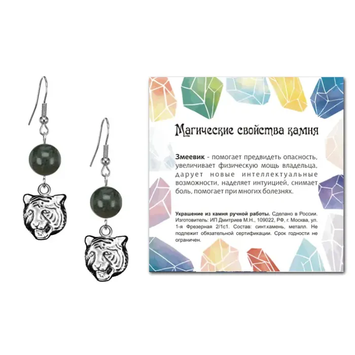 Серьги Тигр (защита, сила, победа), Змеевик SEB07-09-10