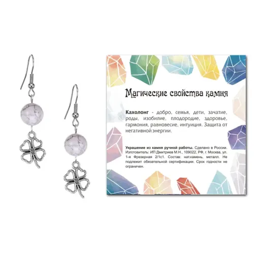 Серьги-амулеты из коллекции MAGIC CRISTALS 2, выполненные с использованием натурального камня Кахолонг, символизируют удачу и везение. Эти стильные серьги имеют диаметр бусин 10 мм и изготовлены из бижутерного сплава с покрытием под серебро. Тип швензы — крючок, что обеспечивает надежную фиксацию. Каждая пара упакована в прозрачный пакет с подвесом и дополнена вкладышем с описанием значения камня, что делает их отличным подарком для близких или приятным приобретением для себя. Серьги не только дополнят образ, но и станут источником положительной энергии благодаря своим амулетным свойствам.