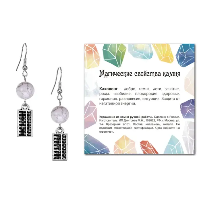 Серьги-амулеты из коллекции MAGIC CRISTALS 2, выполненные с использованием натурального камня Кахолонг, символизирующего богатство и процветание. Эти элегантные серьги имеют диаметр бусин 10 мм и изготовлены из бижутерного сплава с покрытием под серебро, что придаёт им стильный вид. Тип швензы — крючок, обеспечивающий удобство ношения. Каждая пара упакована в прозрачный пакет с подвесом и дополнена вкладышем с описанием значения камня, что делает их отличным подарком или украшением для себя.