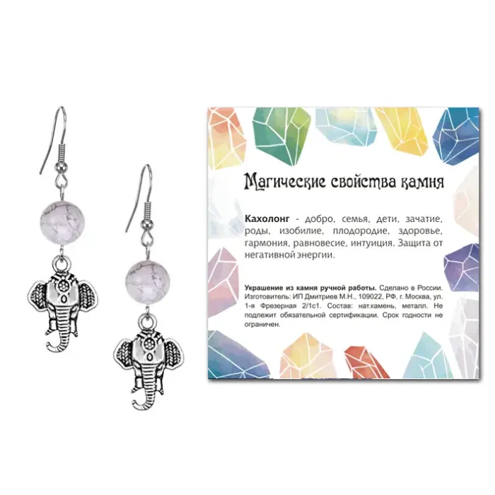 Серьги Слон (мудрость, сила, долголетие), Кахолонг SEB07-10-26