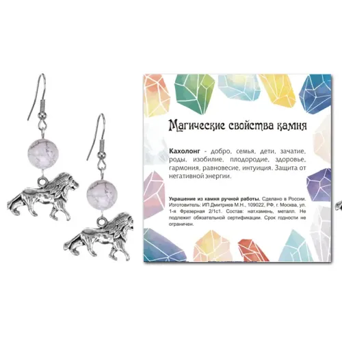 Серьги-амулеты из коллекции MAGIC CRISTALS 2 — это не просто украшение, а символ храбрости и власти. Изготовленные с использованием натурального камня Кахолонг, они традиционно ценятся за свои защитные свойства и приносят благосостояние. Диаметр бусин составляет 10 мм, а фурнитура выполнена из бижутерного сплава с покрытием под серебро для долговечности и стиля. Тип швензы — крючок, что обеспечивает комфорт при ношении. Каждая пара упакована в прозрачный пакет с подвесом и комплектуется вкладышем с описанием значения камня, создавая уникальный подарок или элемент личной коллекции.