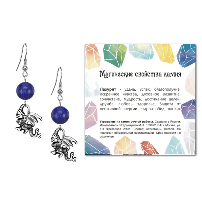 - Упакованы в прозрачный пакет с подвесом, а также комплектуются вкладышем с описанием значения камня Лазурит.