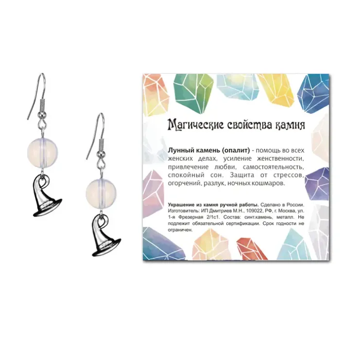 Фурнитура изготовлена из бижутерного сплава с покрытием под серебро, обеспечивая долговечность и стильный внешний вид. Тип швензы — крючок, что делает их удобными в ношении. Каждая пара упакована в прозрачный пакет с подвесом и комплектуется вкладышем с описанием значения камня, что добавляет элемент уникальности и познавательности.