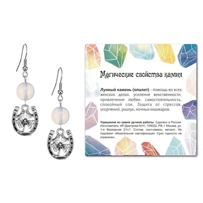 Серьги-амулеты из коллекции MAGIC CRISTALS 2, символизирующие счастье и удачу. Эти элегантные серьги выполнены с использованием синтетического камня Лунный камень (Опалит), который традиционно ценится за свою способность приносить гармонию и спокойствие. Диаметр бусин составляет 10 мм, а фурнитура изготовлена из бижутерного сплава с покрытием под серебро, что придаёт изделию особый блеск. Тип швензы — крючок, обеспечивающий комфортное ношение. Серьги упакованы в прозрачный пакет с подвесом и дополнены вкладышем с описанием значения камня, что делает их идеальным подарком для близких.