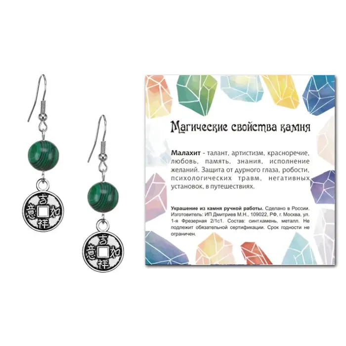 Серьги-амулеты коллекции MAGIC CRISTALS 2, выполненные с синтетическим камнем Малахит, символизируют богатство и процветание. Эти изысканные серьги имеют диаметр бусин 10 мм и изготовлены из бижутерного сплава с покрытием под серебро, что придаёт им элегантный вид. Тип швензы — крючок, обеспечивающий комфортное ношение на протяжении всего дня. Каждая пара упакована в прозрачный пакет с подвесом и дополнена вкладышем с описанием значения камня, что делает их отличным подарком для близких или самих себя. Серьги традиционно ценятся за свою красоту и смысловое значение в культуре украшений.