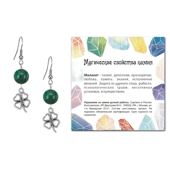 Серьги-амулеты коллекции MAGIC CRISTALS 2 с синтетическим камнем Малахит символизируют удачу и везение. Эти изысканные серьги не только дополняют образ, но и приносят положительную энергетику. Основные особенности включают: