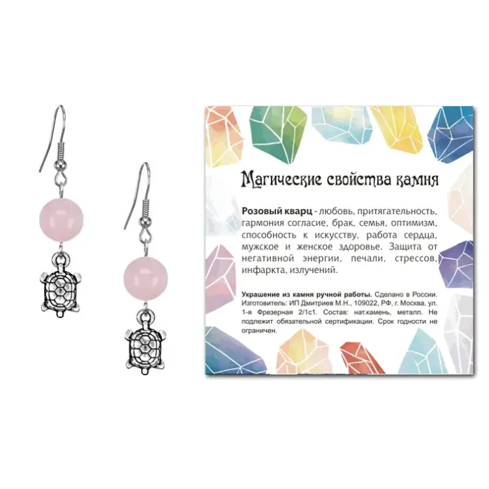Серьги Черепаха (здоровье и долголетие), Розовый кварц SEB07-17-16