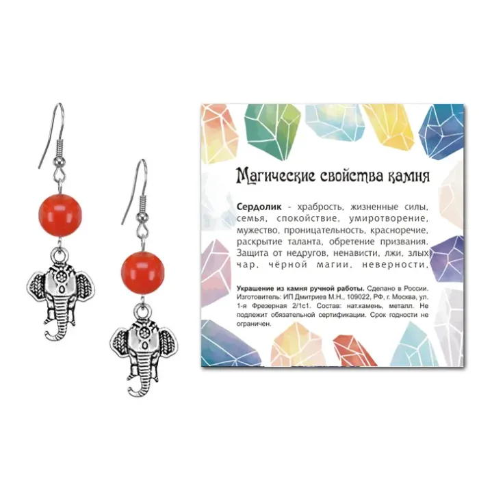 Серьги Слон (мудрость, сила, долголетие), Сердолик SEB07-18-26