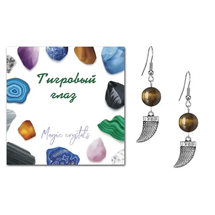 Серьги-амулеты коллекции MAGIC CRISTALS 2 с натуральным камнем Тигровый глаз обладают символикой силы и мужества. Эти украшения не только подчеркивают индивидуальность, но и традиционно используются как оберег для привлечения энергии и уверенности. Диаметр бусин составляет 10 мм, а материал фурнитуры — бижутерный сплав с покрытием под серебро. Тип швензы — крючок обеспечивает удобство в носке. Упаковка выполнена в виде прозрачного пакета с подвесом и включает вкладыш с описанием значения камня, что делает эти серьги отличным подарком или личным амулетом.