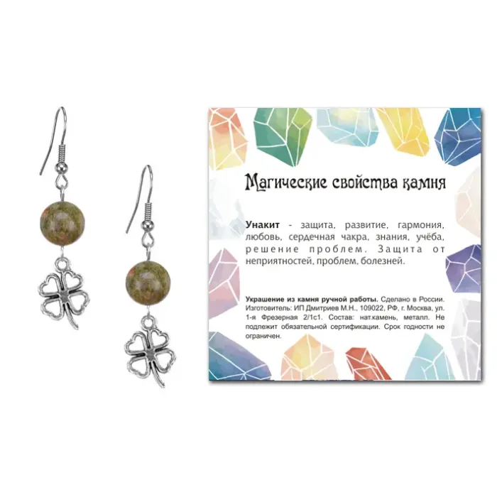 4. Каждая пара упакована в прозрачный пакет с подвесом и дополнена вкладышем с описанием значения камня для дополнительной информации.