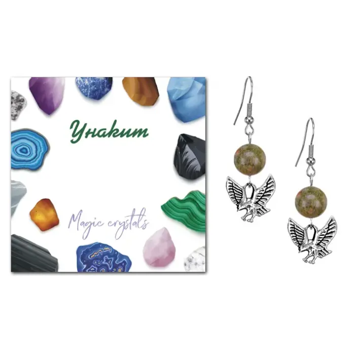 4. Каждая пара упакована в прозрачный пакет с подвесом и укомплектована вкладышем с описанием значения камня Унакит.