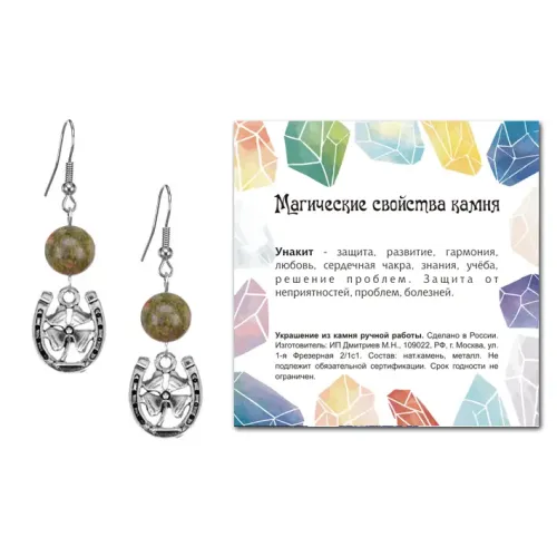 - Каждая пара упакована в прозрачный пакет с подвесом и комплектуется вкладышем с описанием значения камня Унакит.
