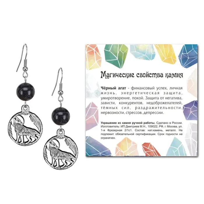 Серьги Волк (защита, сила, победа), Черный агат SEB07-22-07