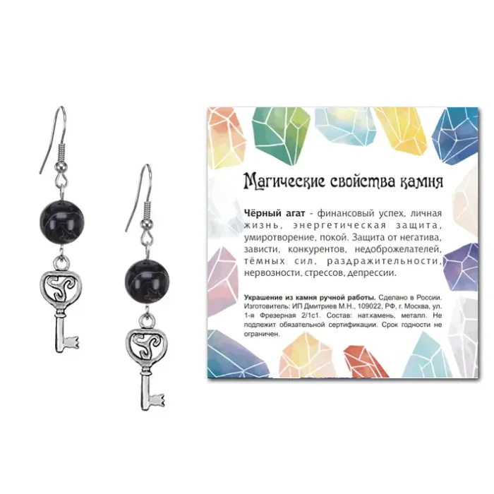 Серьги Ключ (счастье), Черный агат SEB07-22-08