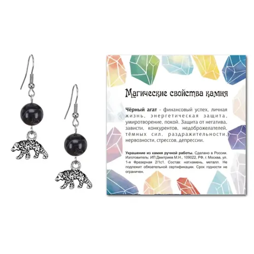 Серьги Медведь (защита, сила, победа), Черный агат SEB07-22-19