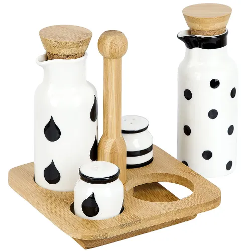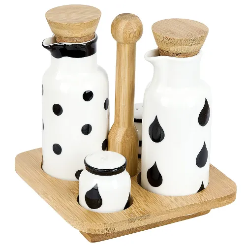 - Материал: фарфор, бамбук- Размеры подставки: 16.5 x 16.5 x 18.5 см- Комплектация: солонка — 1 шт., перечница — 1 шт., бутылка — 2 шт., подставка — 1 шт.- Совместимость: не предназначен для использования в СВЧ-печи и посудомоечной машине- Уход: рекомендуется ручная мойка с нейтральными средствами; следует избегать длительного контакта бамбуковой подставки с водой