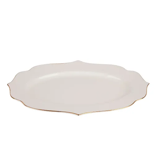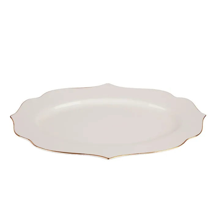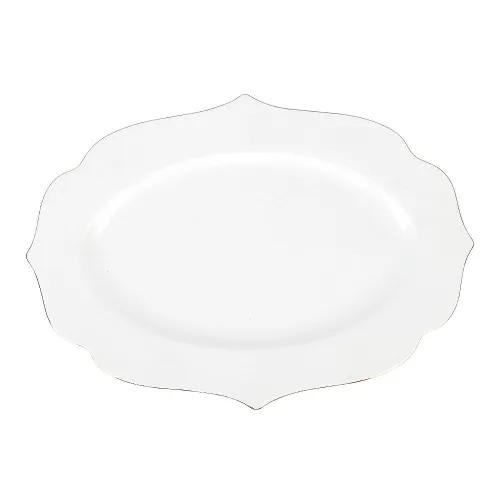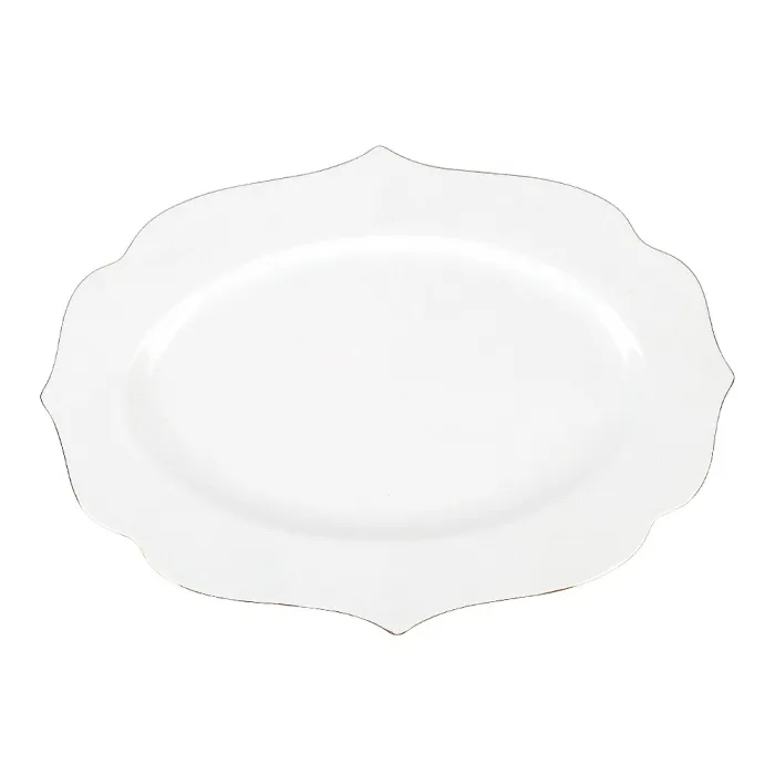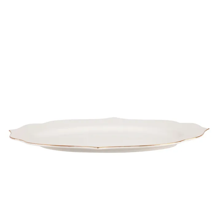 Блюдо изготовлено из фарфора, материала, известного своей прочностью и гигиеничностью. Декоративная золотая окантовка нанесена на поверхность изделия. Конструкция блюда имеет фигурную форму, что является элементом его дизайна.